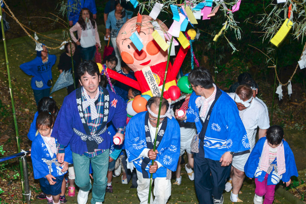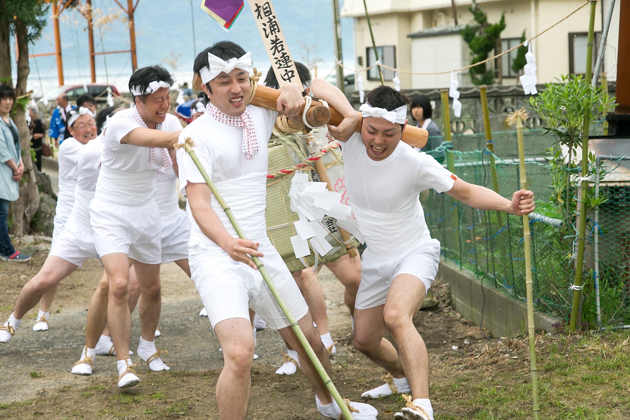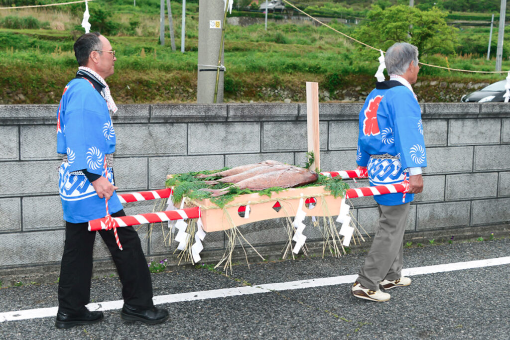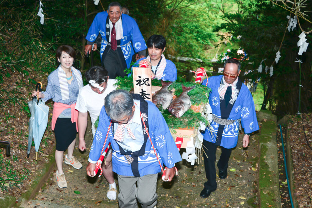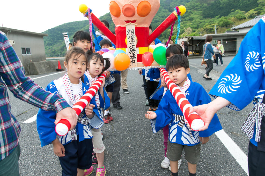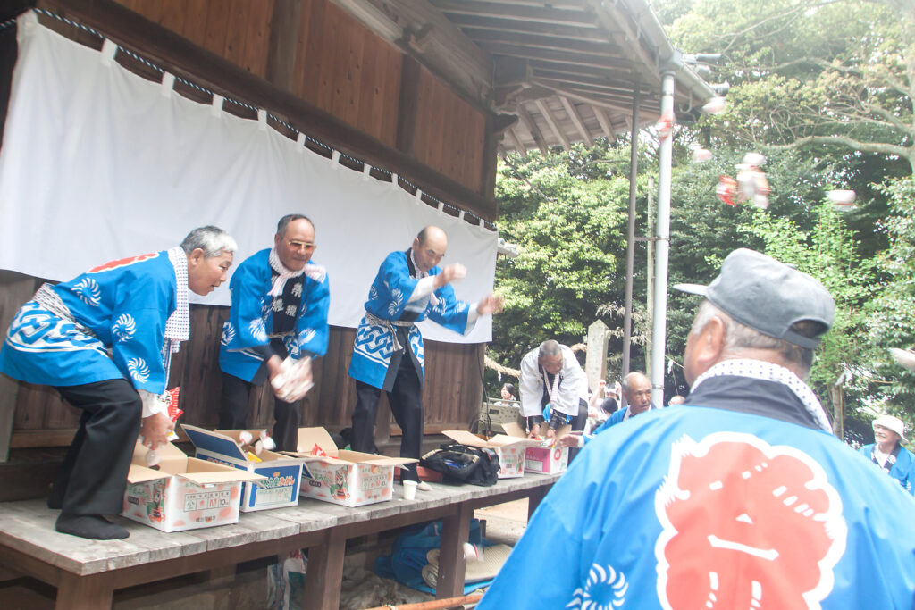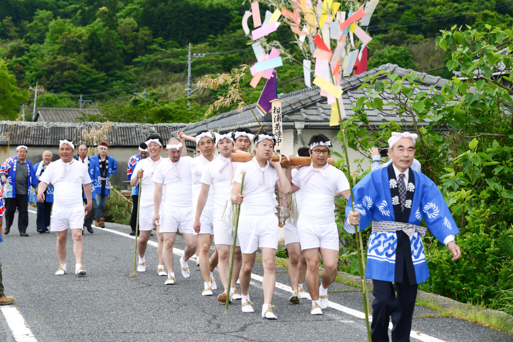 当日は、あいにくの雨にもかかわらず若者たちの威勢の良い掛け声が相の浦地区に響きわたり、餅まきや子供みこし、カラオケなどの催しもあり活気に満ちた一日となった。